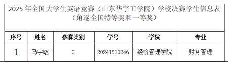 近日,全国大学生英语竞赛(山东赛区)决赛成绩公布。leyu乐鱼在线官网经济管理学院2024级财务管理专业的马宇晗国家级(C类)一等奖