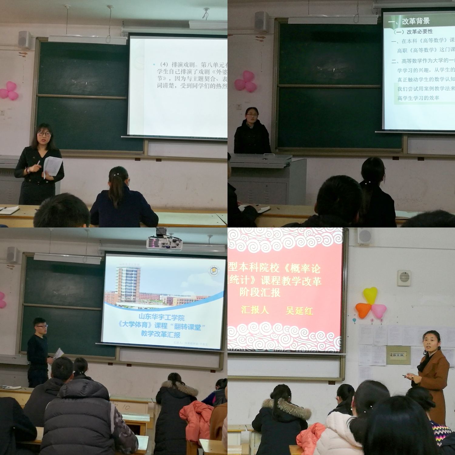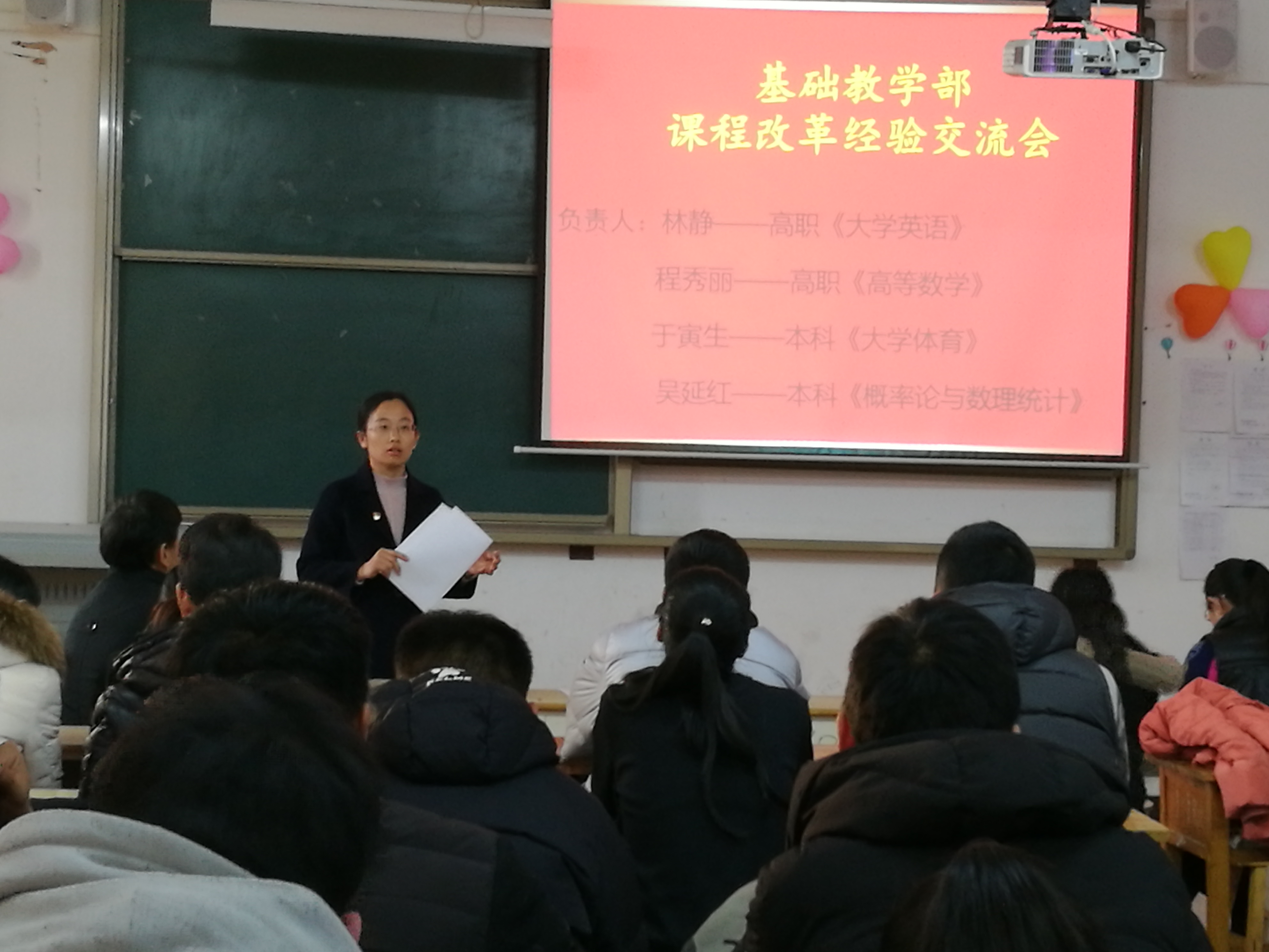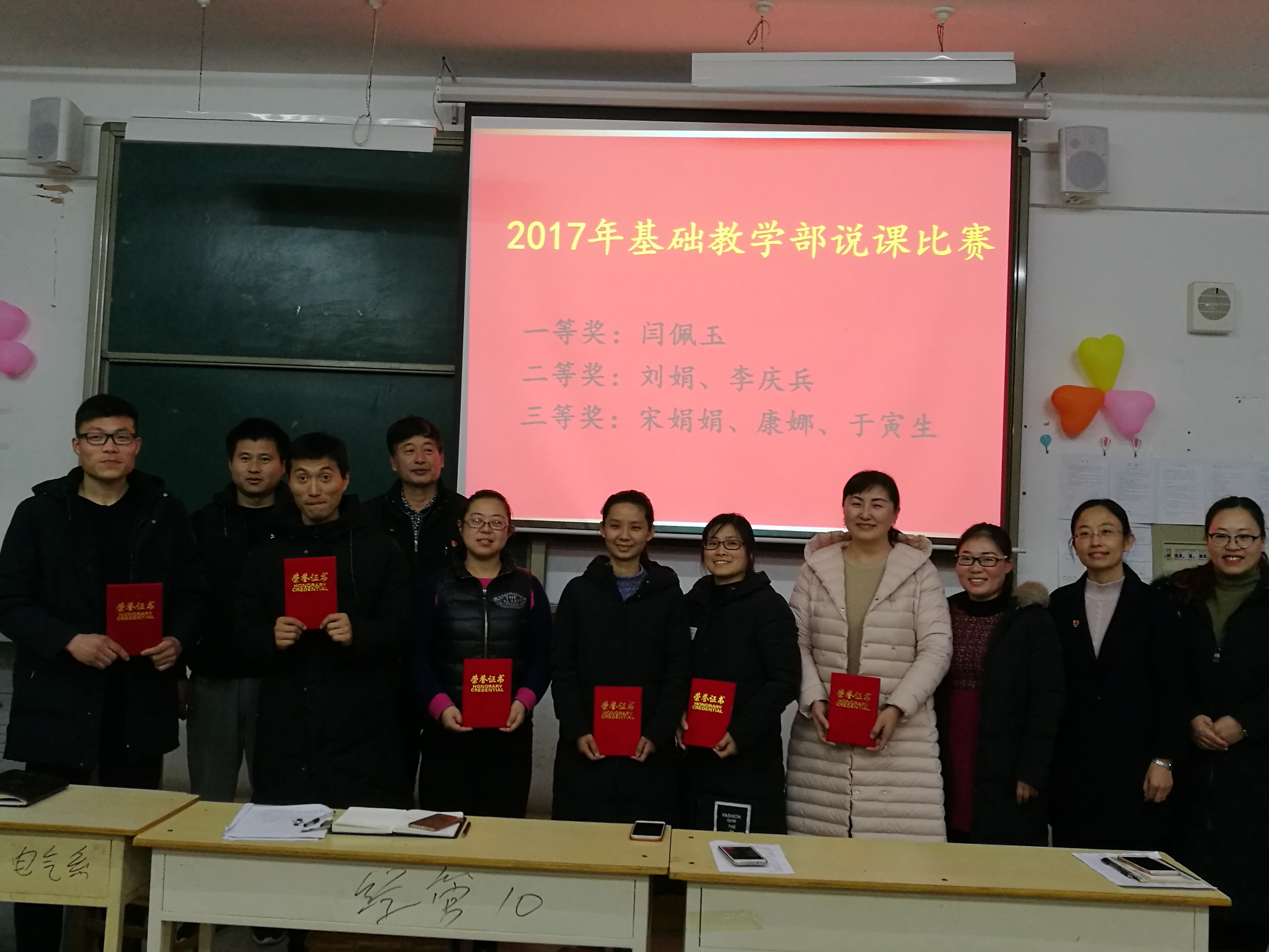 此次大会分为:课程改革经验交流、表彰先进、工作总结三个部分。课程改革经验交流主要为高职《大学英语》、高职《高等数学》、本科《大学体育》和本科《概率论与数理统计》四门课改课程的阶段性成果汇报。林静老师、程秀丽老师、于寅生老师、吴延红老师分别对所负责课改课程进行了总结,四位老师带领其教学改革团队,按照leyu乐鱼在线官网推行课改课程的要求,积极进行课程模式和教学方法的改革。表彰先进主要对在本年度2017年基础教学部优秀教案、2017年基础教学部讲课比赛、2017年基础教学部说课比赛中取得优秀成绩的个人进行表彰。基础教学部副主任李琦、基础教学部副主任刘兖峰,以及英语、数学、体育、物理教研室主任共同为获奖的18名教师颁奖并合影留念。在场老师为获奖教师鼓掌祝贺,纷纷表示要向先进教师学习,鼓足干劲,奋起直追,不断提升教育教学能力。