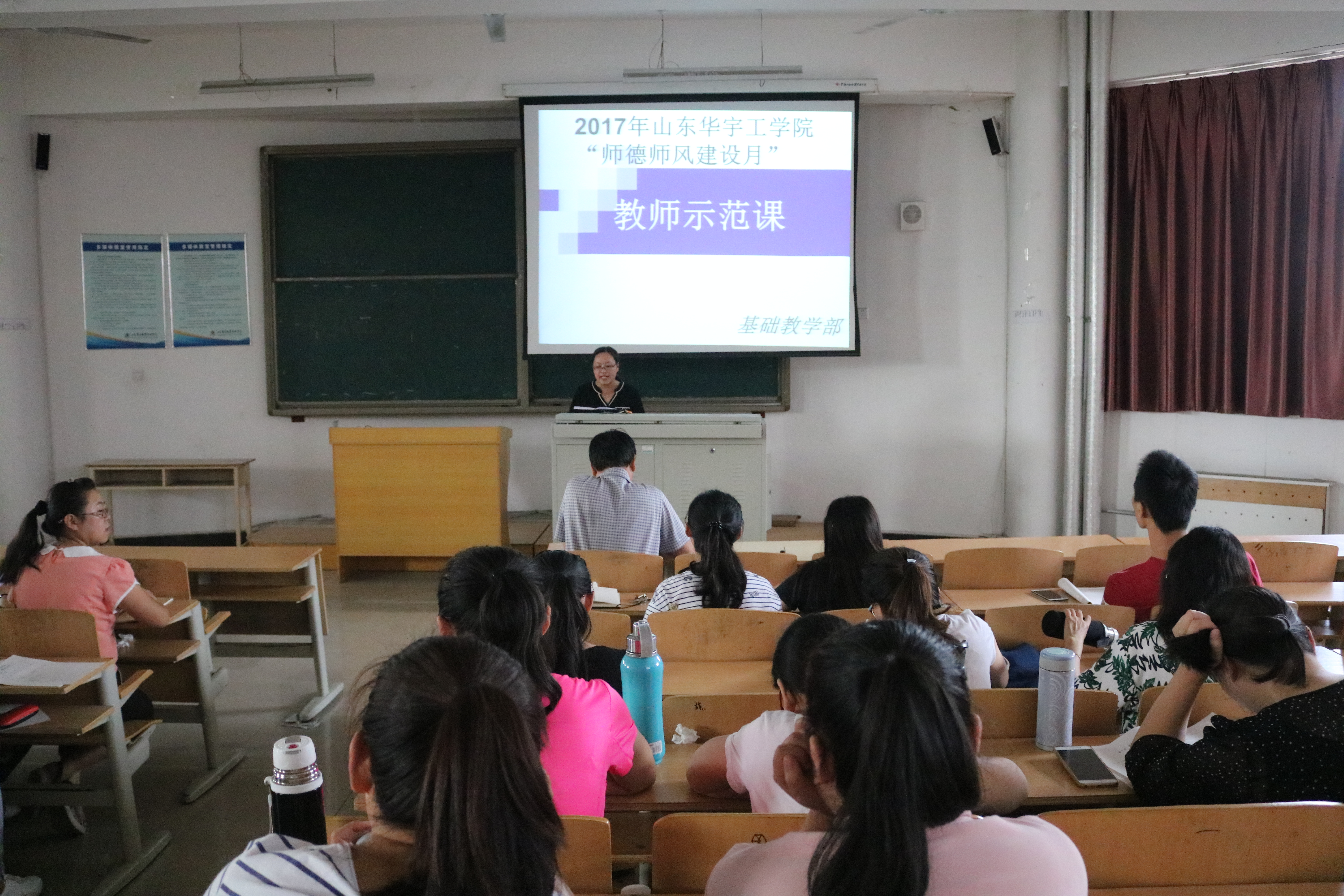 活动中,刘老师首先对数学教研室申立平老师与英语教研室林佰新老师做了简要介绍,并传达了2017年山东华宇工学院“师德师风建设月”活动精神和相关工作要求。接着,结合我部实际情况,邀请申老师与林老师进行示范课的讲授。并邀请数学教研室主任闫佩玉老师与英语教研室秦毅老师进行了点评。