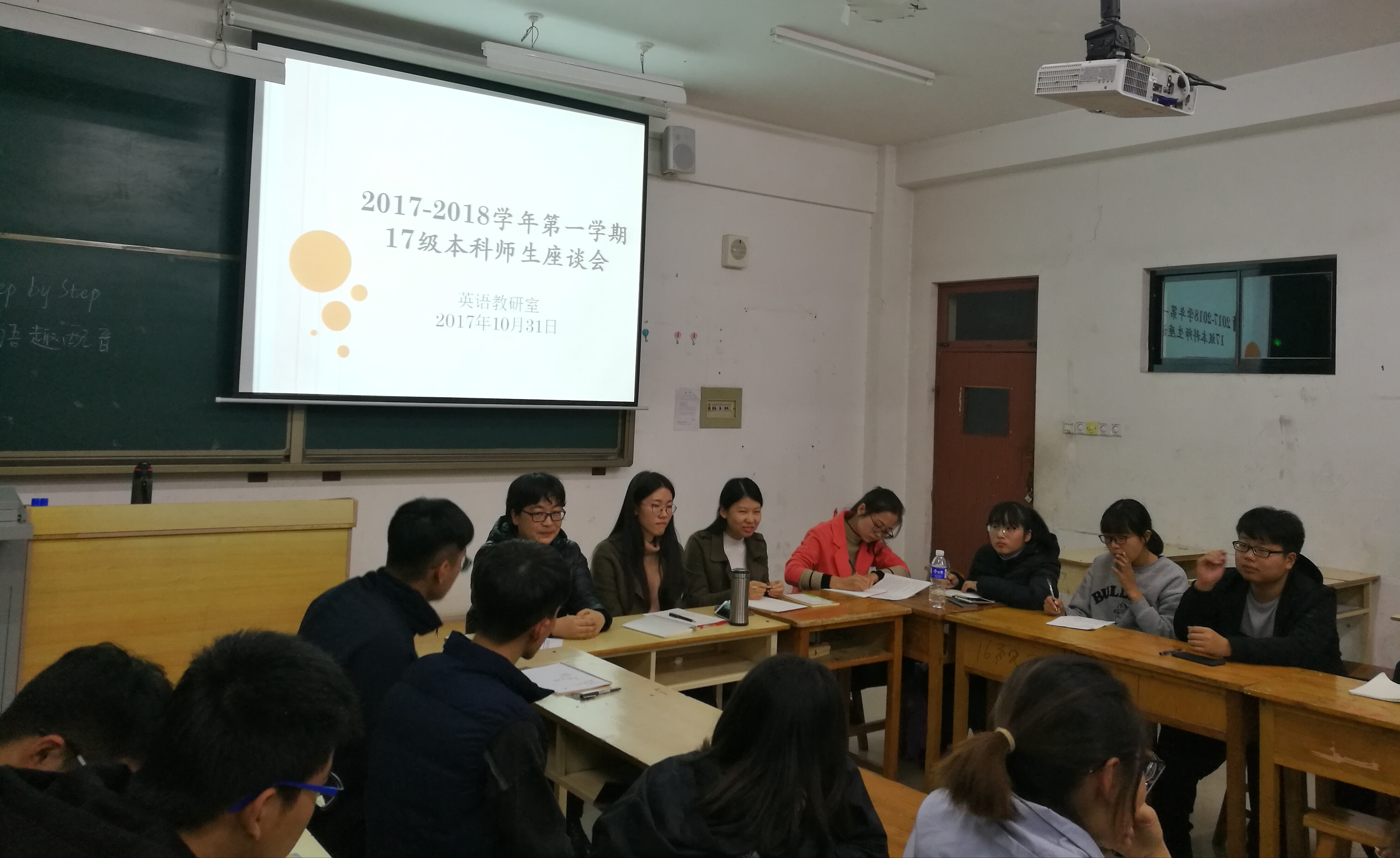 为更深入地了解同学们大学英语学习现状,更好地促进大学英语教学,英语教研室于10月31日及11月1日下午4时分别在10号楼211、213,21号楼105召开了期中师生交流座谈会。此次座谈会分别由各层次备课组长主持召开,英语教研室各层次任课教师来自各专业年级学生代表参加了座谈会。