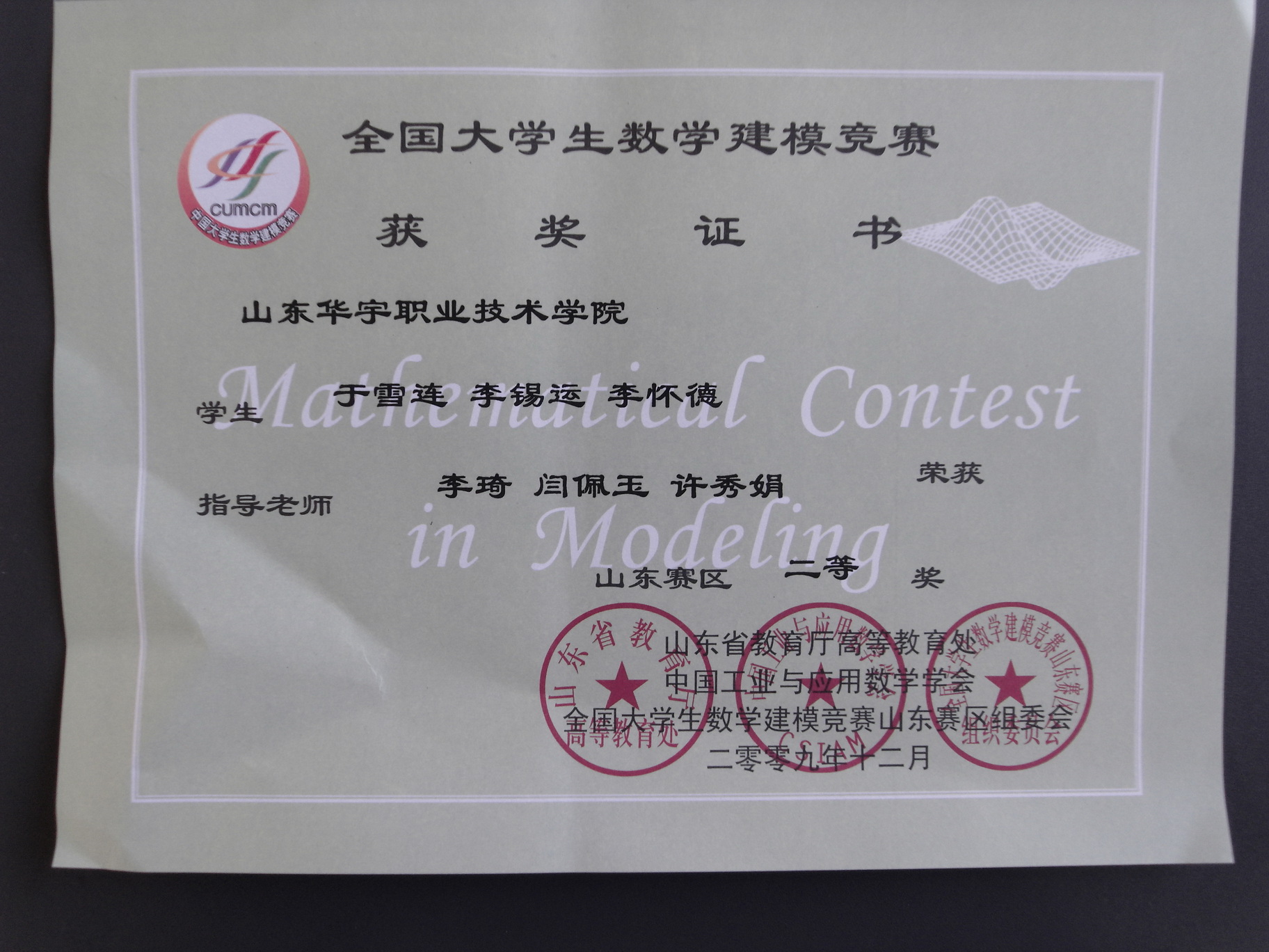 leyu乐鱼在线官网学生在2009年“高教社”杯全国大学生数学建模大赛上喜获佳绩。leyu乐鱼在线官网两支代表队纷纷夺得山东赛区二等奖。2010年1月5日,获奖证书抵达我部。