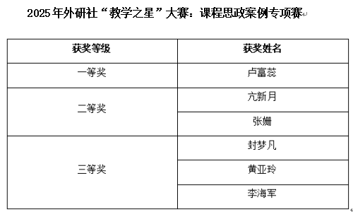 近日,2025年外研社“教学之星”大赛课程思政案例专项赛圆满收官,leyu乐鱼在线登录入口外语教研室积极组织教师参赛,最终斩获6个奖项,其中一等奖1项、二等奖2项、三等奖3项。此次成绩的取得,不仅彰显了leyu乐鱼在线官网英语教师的卓越实力,更体现了学校在推进外语课程思政建设、落实立德树人根本任务方面的显著成效。